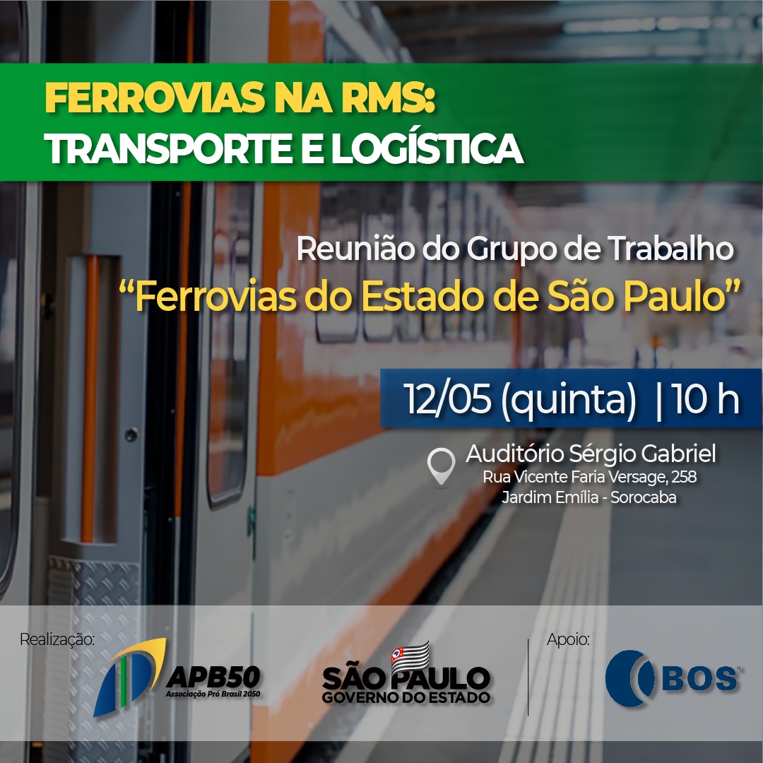 Na próxima quinta-feira (12), a Associação Pró Brasil 2050 (APB50) e o Governo do Estado de São Paulo promoverão uma reunião entre o Grupo de Trabalho “GT Ferrovias do Estado de São Paulo”, empresários e autoridades da Região Metropolitana de Sorocaba (RMS), para discutir o planejamento ferroviário regional e a implantação do “Plano de Ação de Transporte e Logística para a Macrometropole Paulista (PAM-TL).