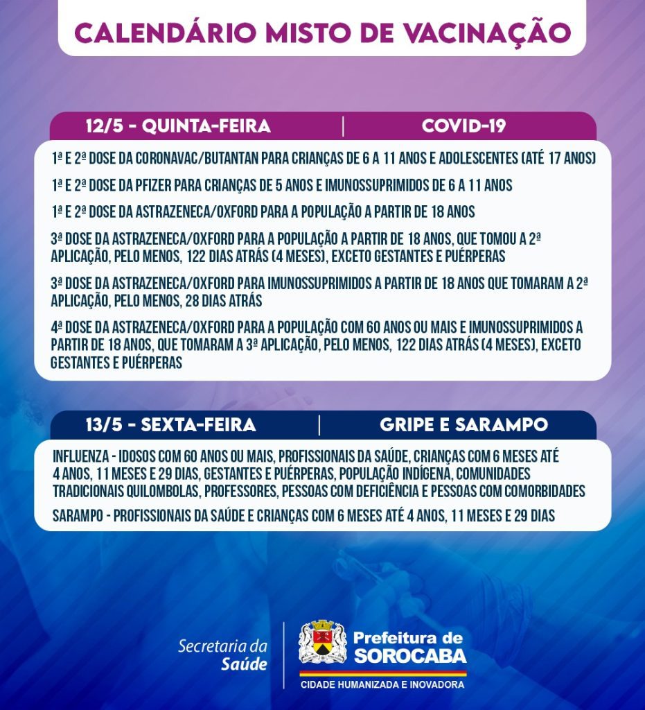 A Prefeitura de Sorocaba, por meio da Secretaria da Saúde (SES), informa o calendário misto de vacinação desta semana (de 9 a 13/5), que imunizará contra Covid-19, gripe (Influenza) e sarampo, nas 33 UBSs (Unidades Básicas de Saúde) da cidade, das 9h às 15h.