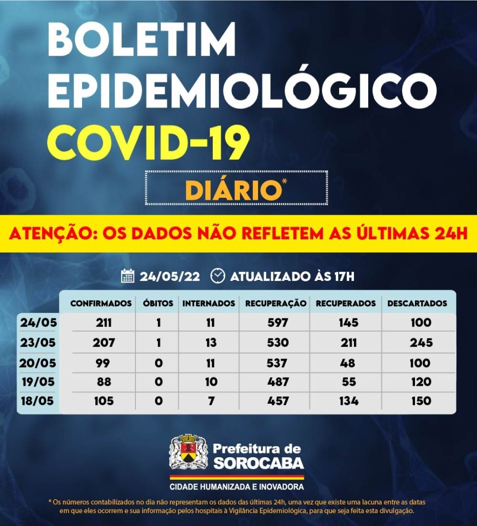 Sorocaba recebeu a notificação de mais 211 casos confirmados da Covid-19, 145 recuperados e um óbito, este ocorrido no dia 19 de maio de 2022, mas informado pelo hospital à Vigilância Epidemiológica e computado apenas no dia de hoje (24 de maio). Do total de confirmados, seis estão internados em UTI, e o total de pessoas em recuperação (isolamento domiciliar) é 597.