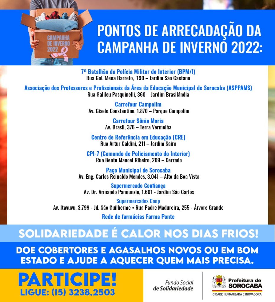 Munícipes, empresas e instituições podem doar esses itens, que beneficiarão, além das famílias que necessitam, também pessoas em situação de rua, que sofrem com as baixas temperaturas do período. Para mais informações sobre como contribuir com a campanha, basta entrar em contato com o Fundo Social de Solidariedade, pelo telefone: (15) 3238-2503.