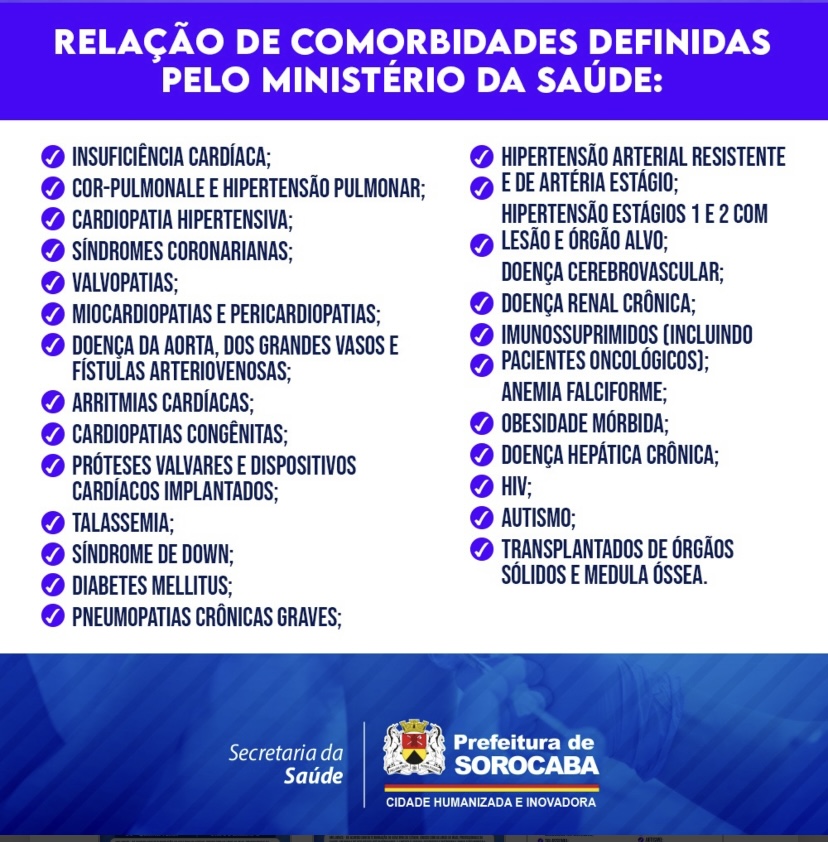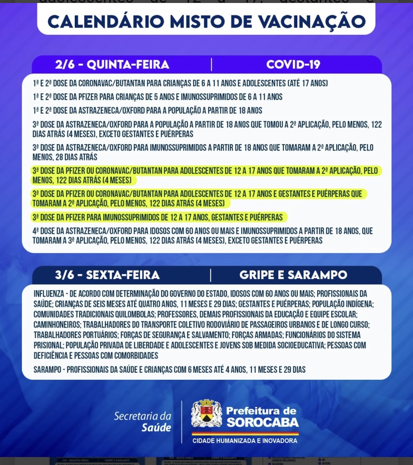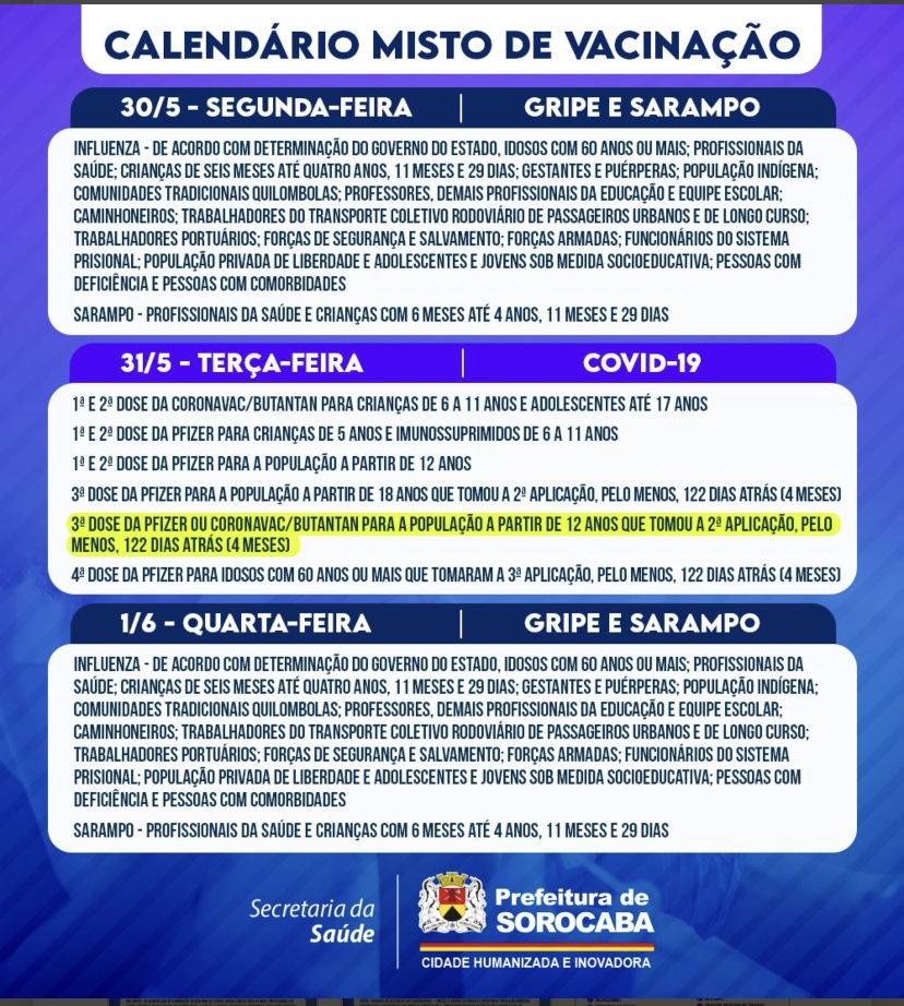 Com a atualização, o calendário misto de vacinação de Sorocaba, na semana de 30/5 a 3/6, passa a contar também, às terças e quintas-feiras, com as seguintes aplicações: