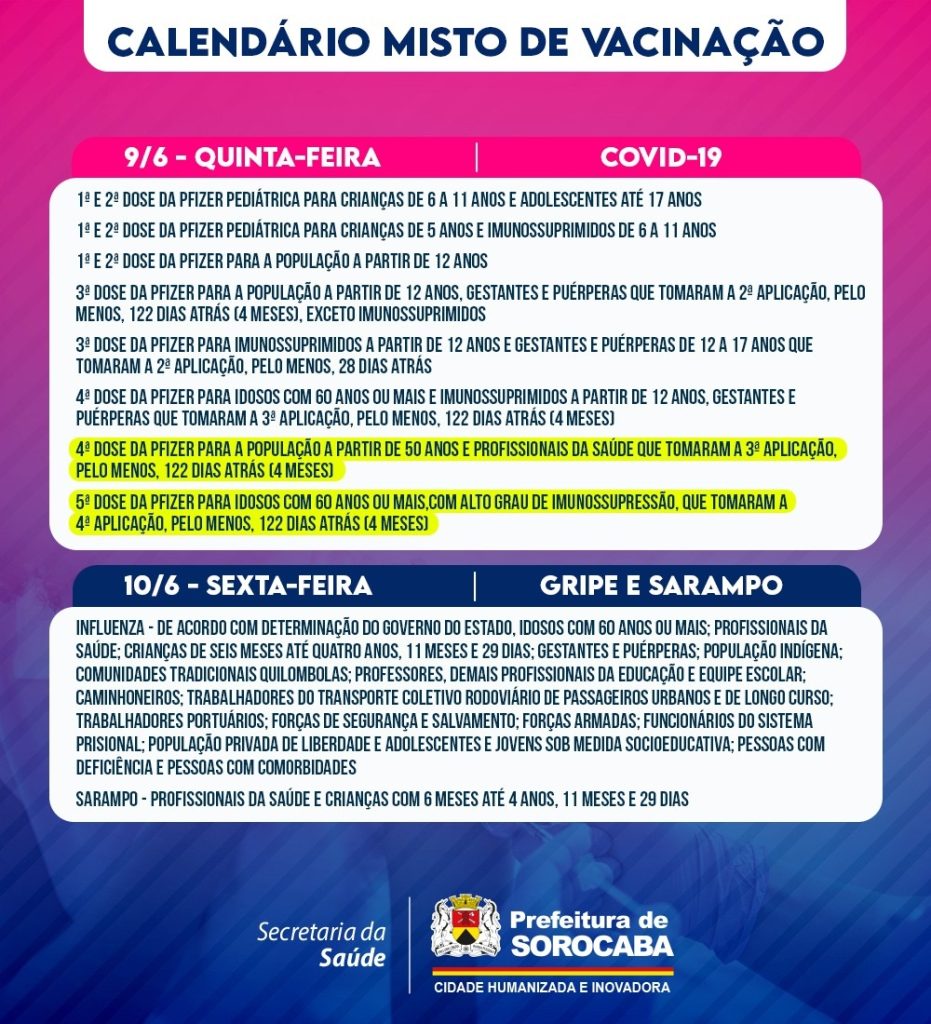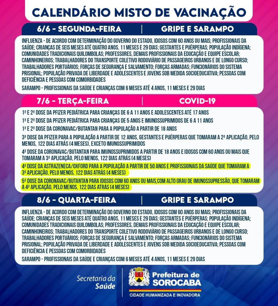 A Prefeitura de Sorocaba, por meio da Secretaria da Saúde (SES), informa o calendário misto de vacinação da próxima semana (6/6 a 10/6), que imunizará contra Covid-19, gripe (Influenza) e sarampo, nas 33 UBSs (Unidades Básicas de Saúde) da cidade, das 9h às 15h.