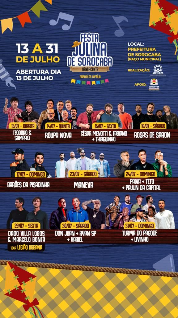A prefeitura de Sorocaba divulgou os detalhes da festa julina, que irá acontecer entre os dias 13 e 31 de julho. A primeira novidade é o local do evento: Diferente dos outros anos, a festa sai do Parque das Águas e será realizada no paço municipal.