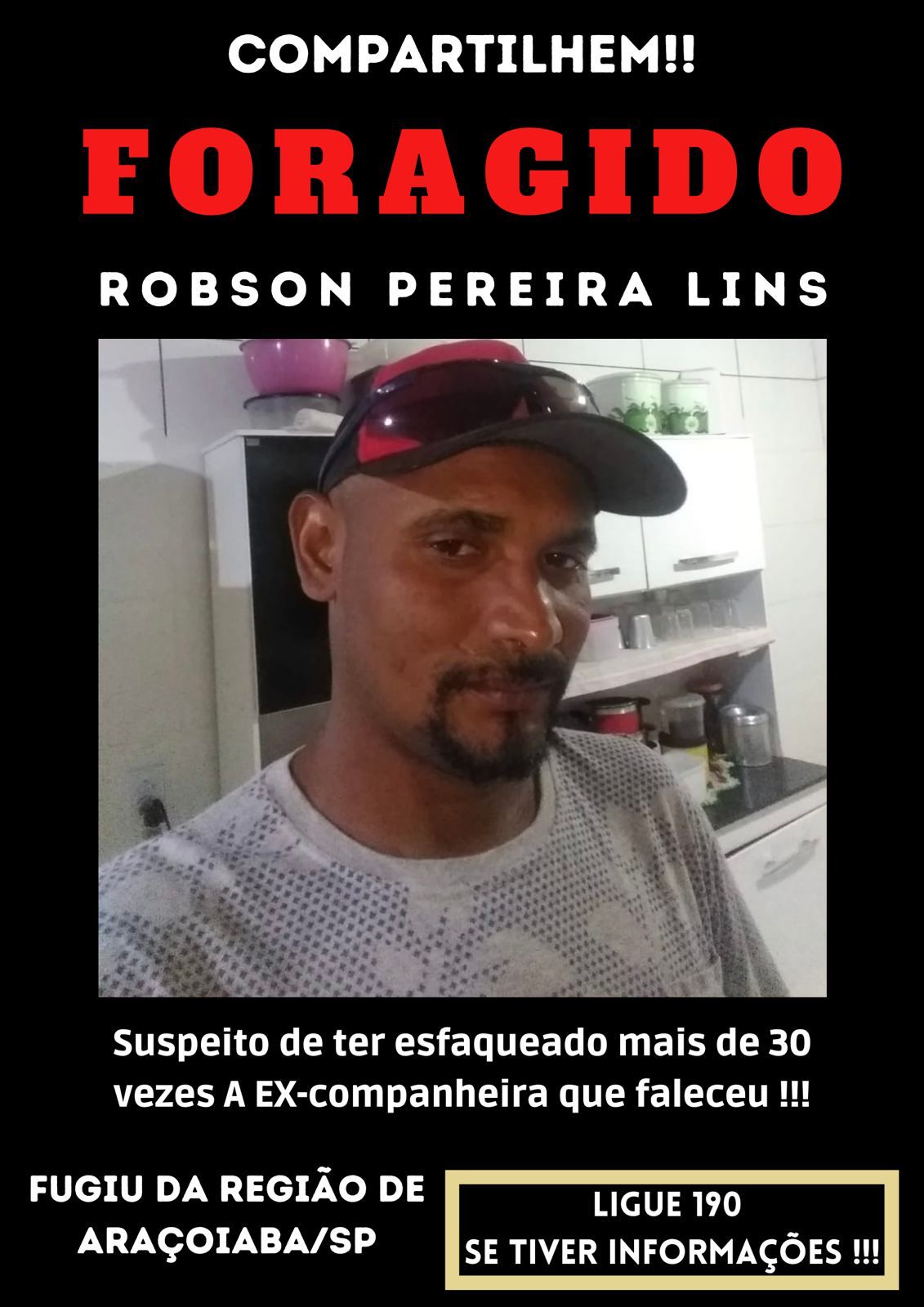 O assassinato de uma mulher, tendo como principal suspeito o ex-companheiro dela, em Araçoiaba da Serra, vem causando grande repercussão na cidade e região. Segundo a polícia, Robson Pereira Lins, é o principal suspeito do crime e continua foragido. Uma campanha nas redes sociais pede para que as pessoas ajudem a encontrá-lo e que denunciem o paradeiro do homem. As denúncias podem ser anônimas.