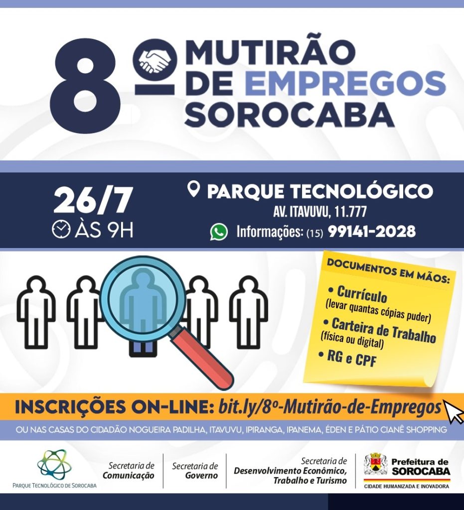 A Prefeitura de Sorocaba, por meio da Secretaria de Desenvolvimento, Trabalho e Turismo (Sedettur), com o apoio da Secretaria de Governo (Segov), Secretaria de Comunicação (Secom) e do Parque Tecnológico de Sorocaba (PTS), realizará, no dia 26 de julho, às 9h, a 8ª edição do Mutirão de Empregos Sorocaba.