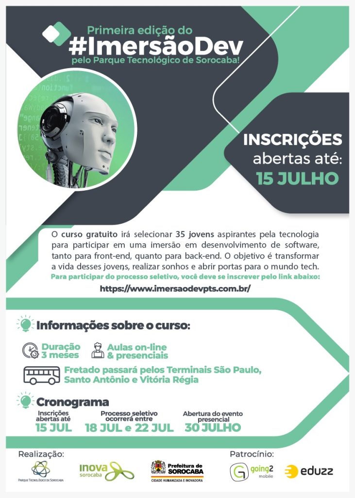 Falou também sobre as inscrições, no dia 15 de julho, para a Primeira Edição do #ImersãoDev. O curso é gratuito e vai selecionar 35 jovens aspirantes pela tecnologia para participar em uma imersão em desenvolvimento de software, tanto para front-end quanto para back-end. O objetivo é transformar a vida desses jovens, realizar sonhos e abrir portas para o mundo tech.
