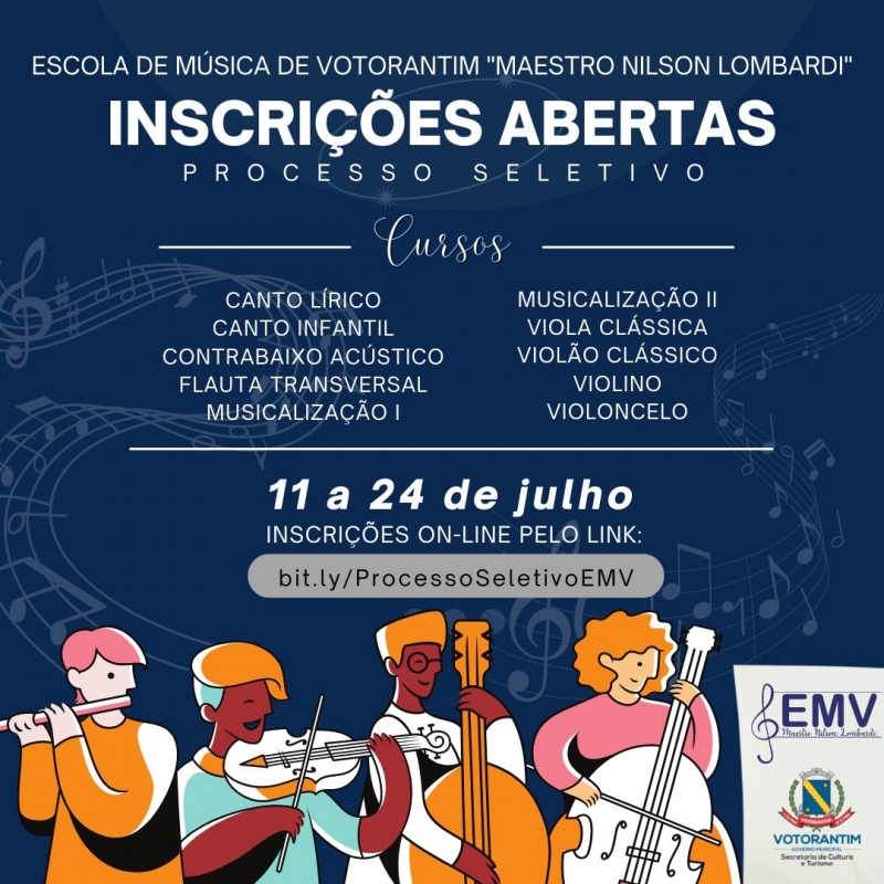 A Escola de Música de Votorantim Maestro Nilson Lombardi está com inscrições abertas. Os interessados podem se cadastrar até o dia 24 de julho por meio do site bit.ly/ProcessoSeletivoEMV. São dez cursos disponíveis. As aulas são gratuitas e não é necessário ter conhecimento prévio.