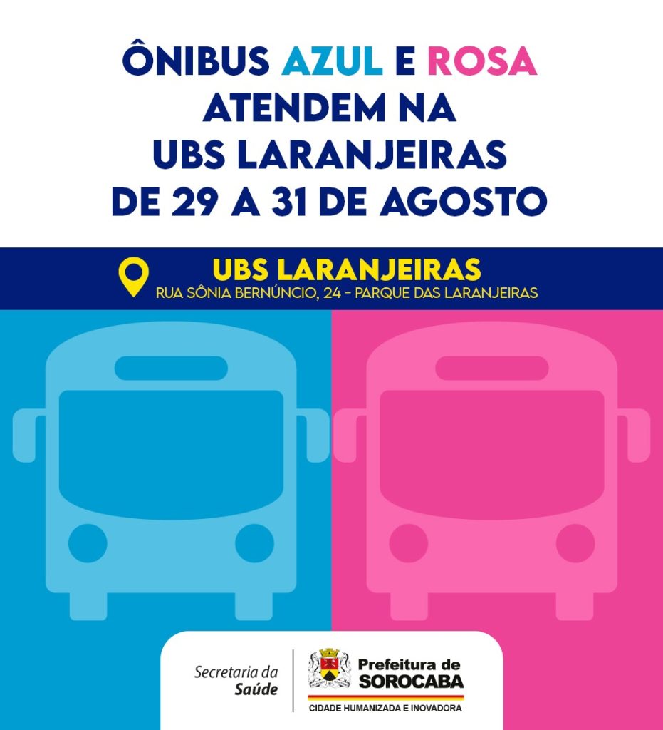 Os Ônibus Azul e Rosa atenderão na UBS Laranjeiras de 29 a 31 de agosto. Os veículos estarão em frente à unidade, localizada na Rua Sônia Bernúncio, 24, no Parque das Laranjeiras.