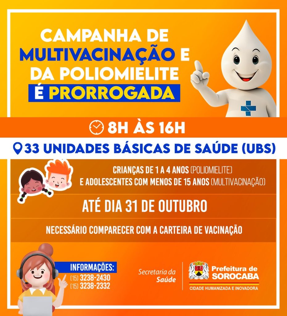 A Prefeitura de Sorocaba, por meio da Secretaria da Saúde (SES), seguirá com a Campanha de Multivacinação e da Poliomielite no município até o dia 31 de outubro. A prorrogação segue orientação do Ministério da Saúde. A aplicação permanece sendo feita nas 33 Unidades Básicas de Saúde (UBS), das 8h às 16h.