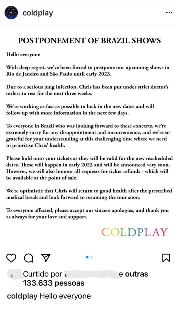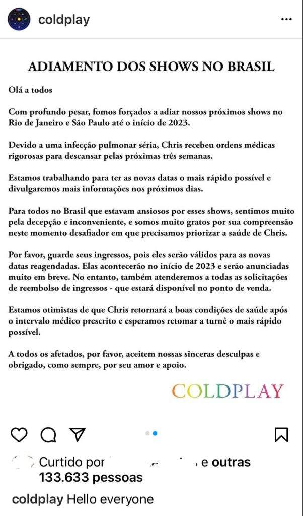 Coldplay não se apresentará mais no Brasil em 2022. Banda adiou shows da turnê Music of the Spheres para o início de 2023 – sem data específica até o momento. Em comunicado nas redes sociais, revelaram que o motivo é infecção pulmonar séria do líder e vocalista, Chris Martin.