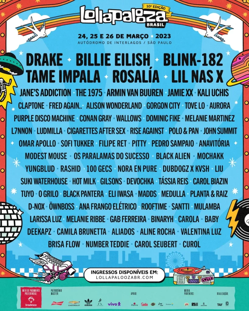 Drake, Billie Eilish, Blink 182, Rosalía e Lil Nas X são as principais atrações do Lollapalooza 2023.