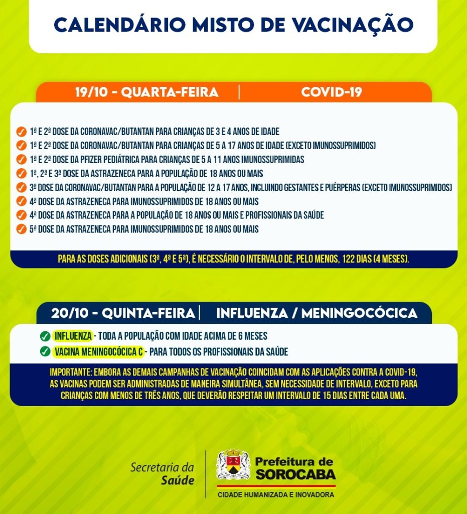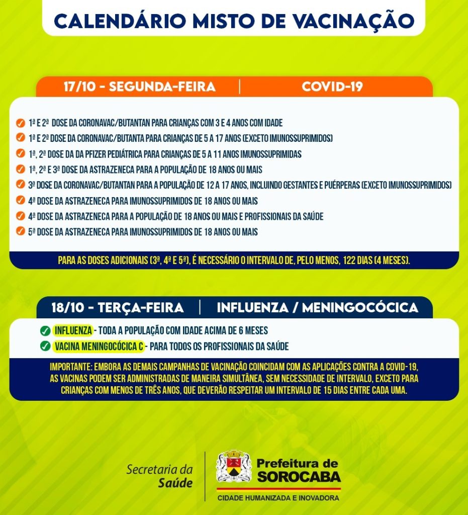 A Prefeitura de Sorocaba divulgou o calendário misto de vacinação da próxima semana (de 17 a 21/10), que imunizará contra Covid-19, gripe (Influenza) e Meningocócica C, nas 33 UBSs (Unidades Básicas de Saúde) da cidade, das 9h às 15h.