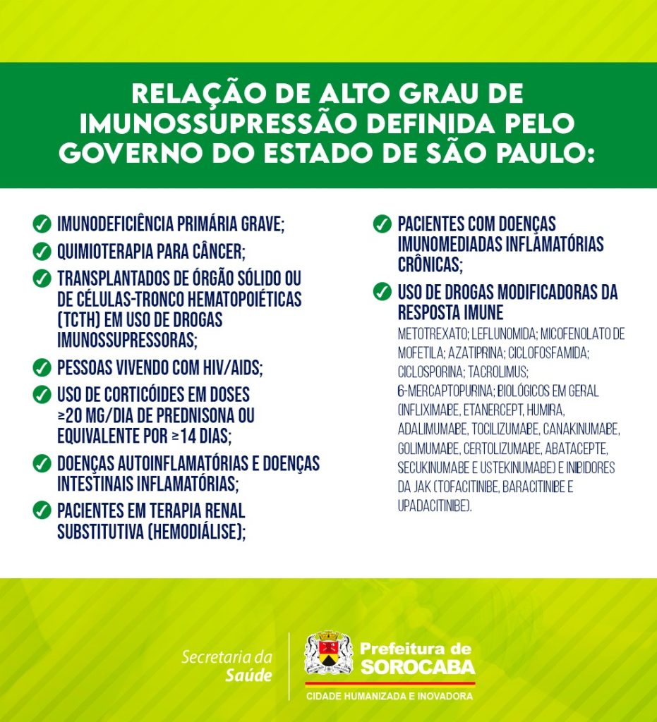 A vacinação contra Covid-19 para crianças (a partir dos três anos), adolescentes e adultos será aplicada nas 33 UBSs, na segunda-feira (17), na quarta-feira (19) e na sexta-feira (21). Adultos e adolescentes necessitam apresentar RG, CPF e comprovante de vacinação da dose já recebida. No caso da pessoa com alto grau de imunossupressão, é necessário apresentar também laudo médico.