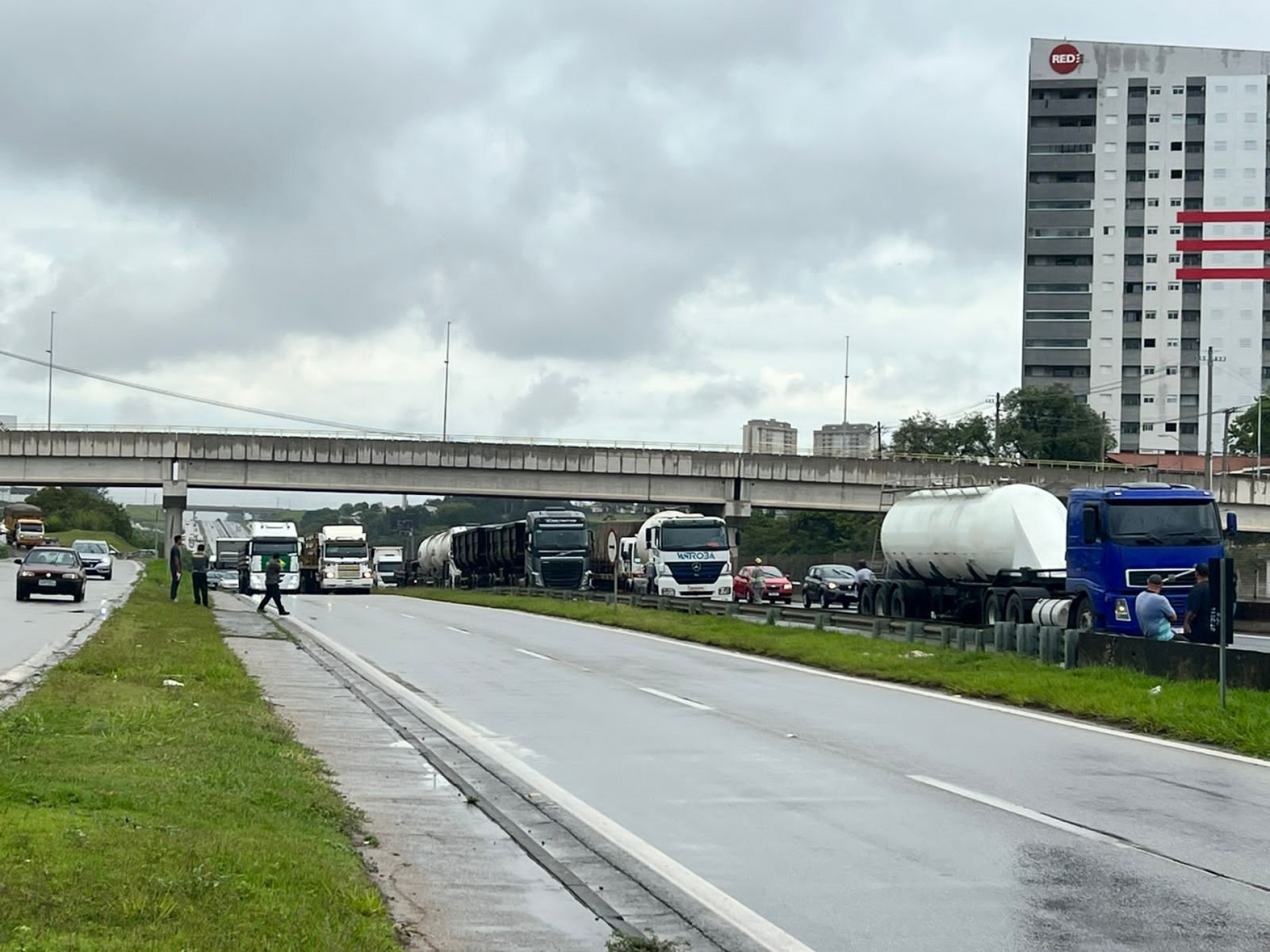 Os veículos foram estacionados nas duas faixas da rodovia, sentido São Paulo, prejudicando o tráfego.