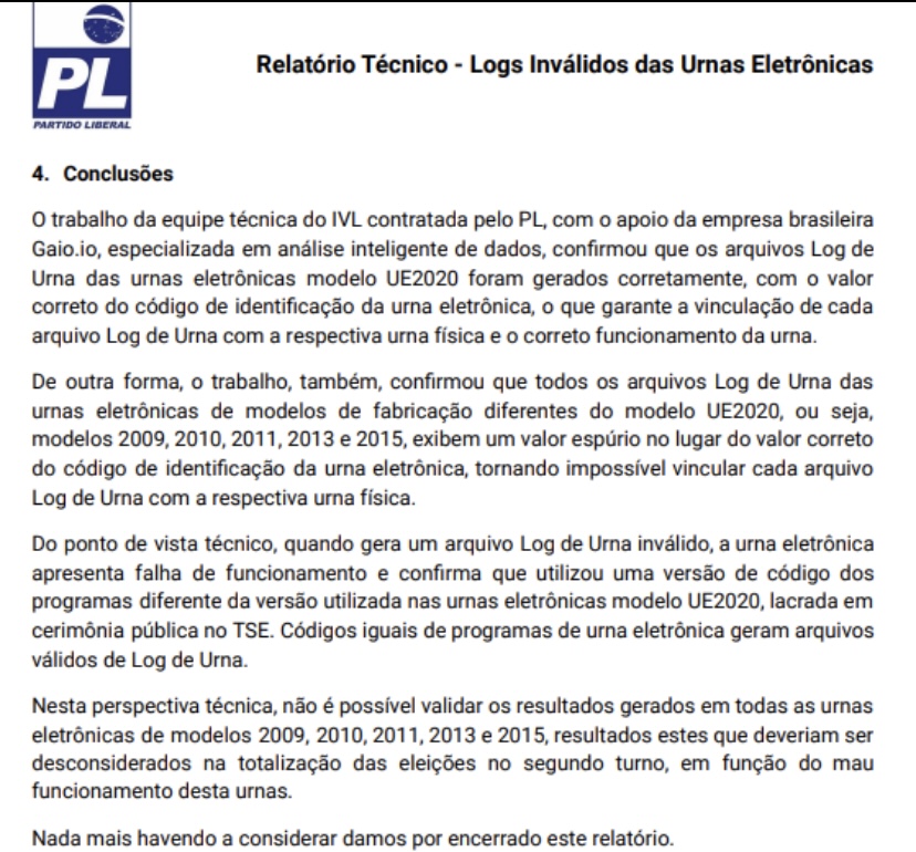 “Para encontrar evidências de que este grupo de urnas não teria funcionado corretamente, foi realizada uma análise inteligente dos dados contidos nos arquivos Log de Urna de todos os modelos de urna eletrônica, utilizados nas eleições de 2022.”