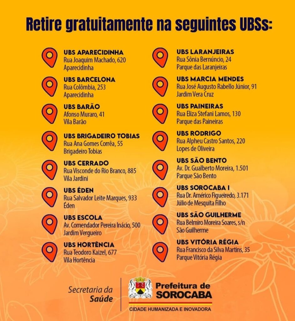 Os cordões serão disponibilizados, a partir do dia 5 de dezembro, nas seguintes UBSs: Aparecidinha; Barcelona; Barão; Brigadeiro Tobias; Cerrado; Éden; Escola; Hortência; Laranjeiras; Marcia Mendes; Paineiras; Rodrigo; São Bento; São Guilherme; Sorocaba 1 e Vitória Régia.