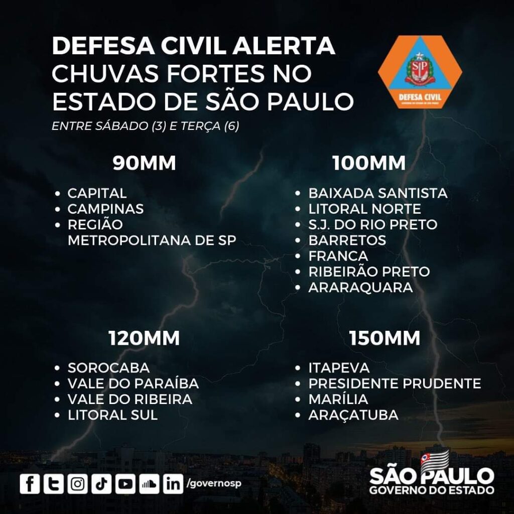 Já, as informações do Centro Nacional de Monitoramento & Alertas de Desastres Naturais (Cemaden) apontam a possibilidade de ocorrência de enxurrada em áreas urbanas com alta declividade em Sorocaba, bem como de continuidade de chuvas de intensidade moderada a forte, nas próximas horas.