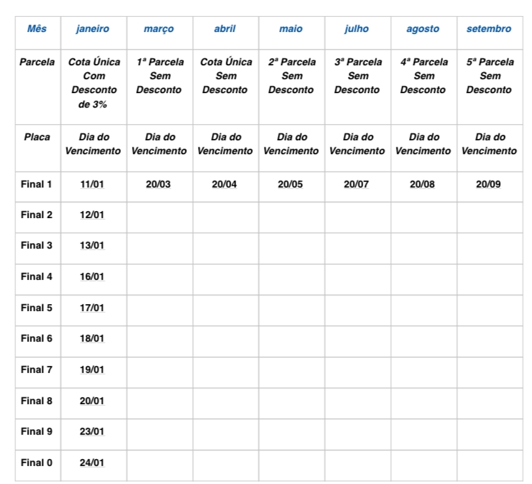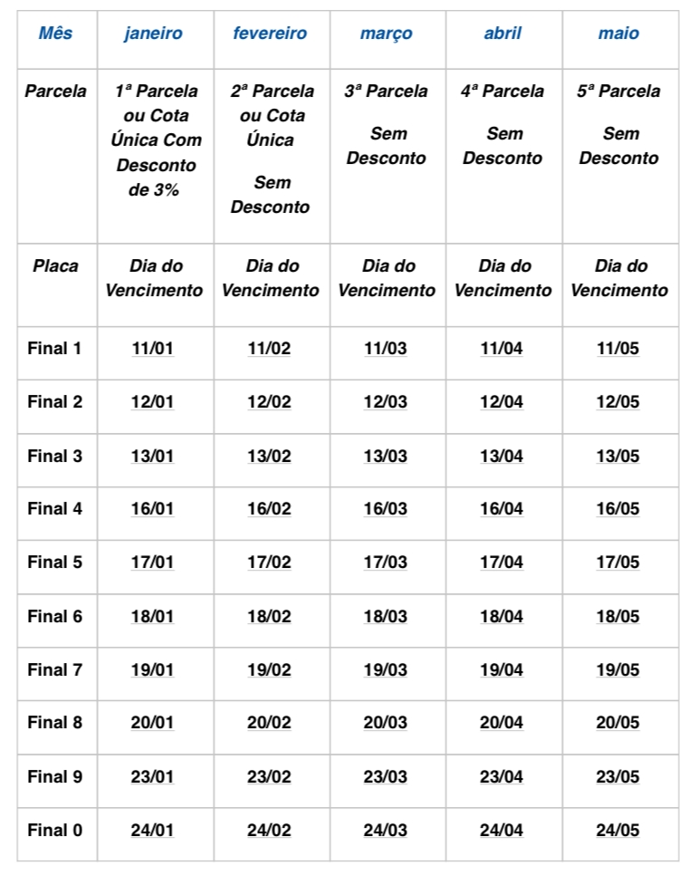 Administrado pela Secretaria da Fazenda e Planejamento, o IPVA continua pelo segundo ano consecutivo com maior prazo de pagamento. Em 2023, será possível quitar o imposto anual em cota única no mês de janeiro, com desconto de 3%, ou em fevereiro, sem desconto. Também será possível parcelar em três, quatro ou cinco vezes iguais e consecutivas, desde que o valor mínimo por cota seja de R$ 68,52: