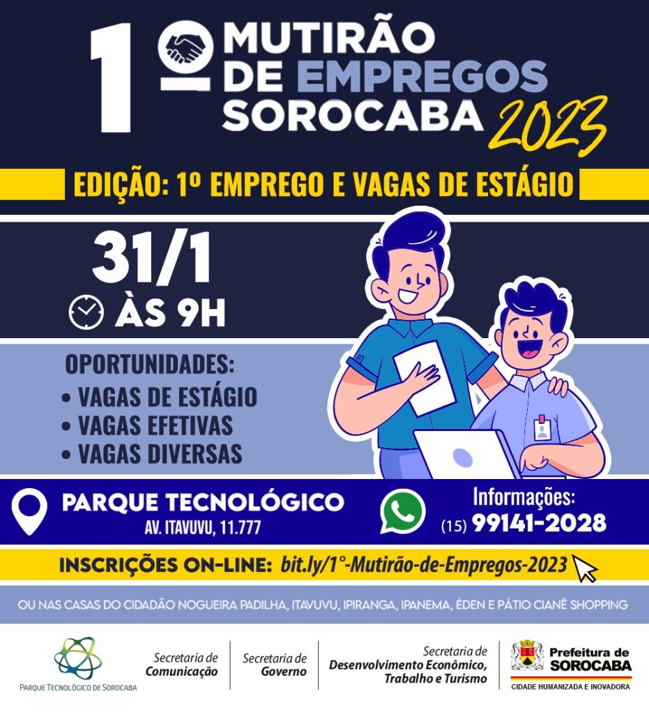 O evento acontecerá no dia 31 de janeiro, no Parque Tecnológico de Sorocaba (PTS), disponibilizando um total de 2.000 vagas de agendamento para candidatos a empregos. As inscrições podem ser feitas pelo link: https://bit.ly/1°-Mutirão-de-Empregos-2023. Os agendamentos também podem ser realizados nas Casas do Cidadão Nogueira Padilha, Itavuvu, Ipiranga, Ipanema, Éden e Pátio Cianê Shopping.