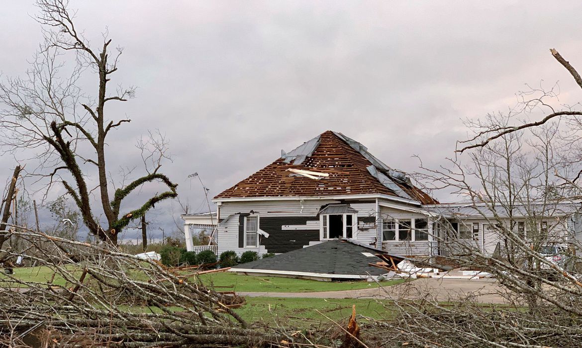 Debris and a damaged house seen following a tornado in Beauregard, Alabama, U.S. in this March 3, 2019 still image obtained from social media video on March 4, 2019. SCOTT FILLMER /via REUTERS ATTENTION EDITORS - THIS IMAGE HAS BEEN SUPPLIED BY A THIRD PARTY. MANDATORY CREDIT. NO RESALES. NO ARCHIVES. MUST CREDIT SCOTT FILLMER. TV MUST ON SCREEN COURTESY SCOTT FILLMER.