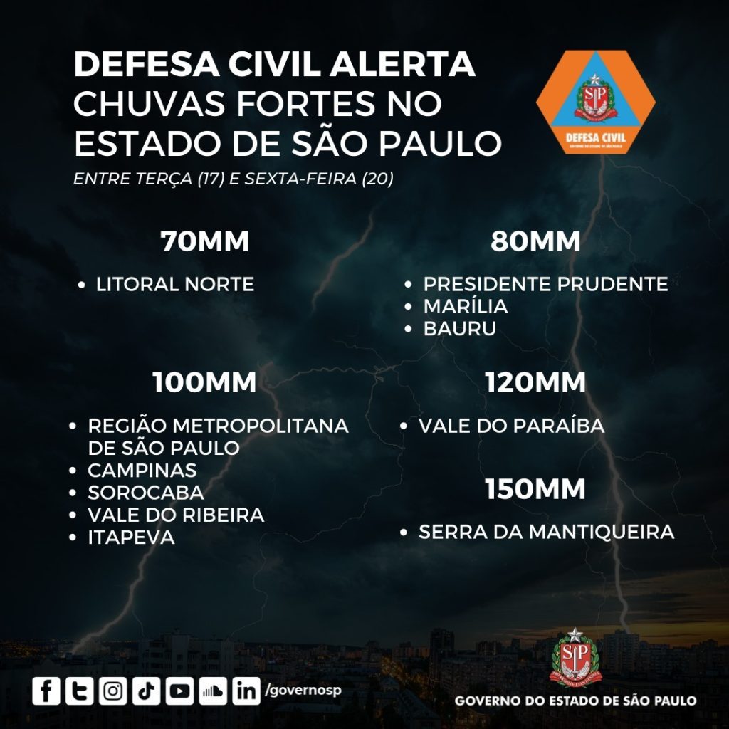A Defesa Civil do Estado de São Paulo alerta a população para um período de chuvas intensas que atingirá todo o estado a partir desta terça-feira, 17 permanecendo até sexta-feira, 20. Segundo dados do Centro de Gerenciamento de Emergência (CGE), há condições de chuvas intensas acompanhadas de descargas elétricas, fortes rajadas de vento e acumulados elevados, aumentando o risco para transtornos, devido a intensas áreas de instabilidade atuando no estado de SP.