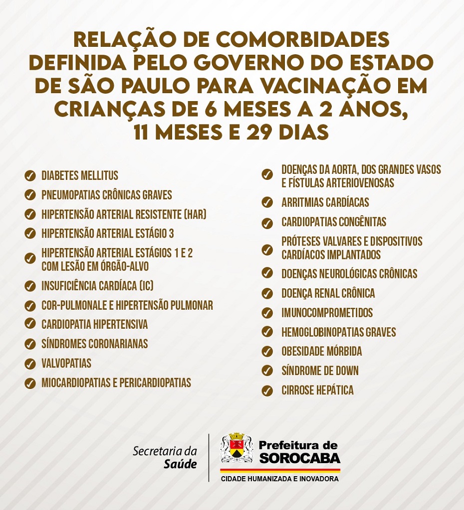 As vacinas serão aplicadas mediante apresentação de RG, CPF e comprovante de vacinação da dose já recebida. No caso de crianças com comorbidades e de pessoas com alto grau de imunossupressão, é necessário apresentar também laudo médico.