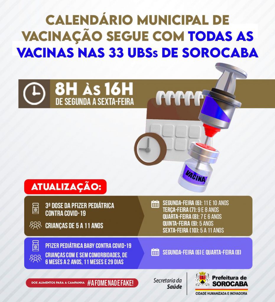 O Calendário Municipal de Vacinação segue atendendo a população com todas as vacinas disponíveis, nas 33 UBSs (Unidades Básicas de Saúde) da cidade de Sorocaba, das 8h às 16h, de segunda a sexta-feira.