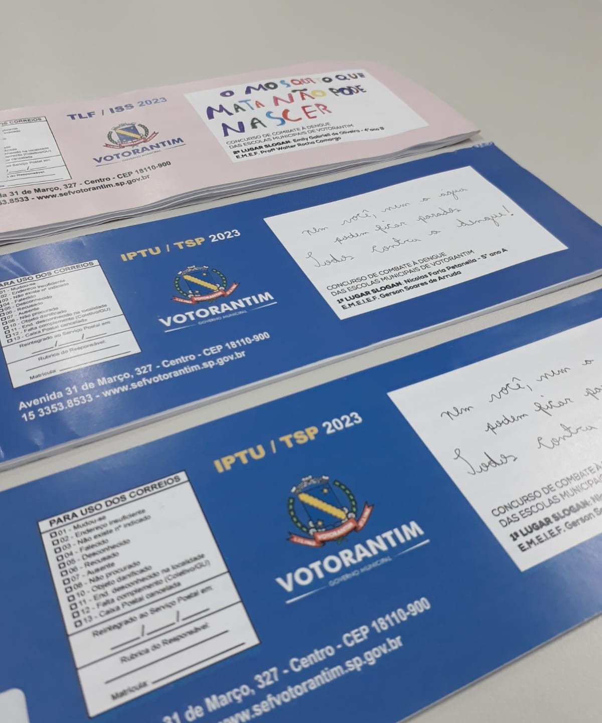 O verso do carnê do IPTU em Votorantim conta com uma campanha de combate à dengue. Um concurso promovido pela Secretaria de Educação selecionou desenhos e frases de alunos de escolas municipais. O resultado pode ser visto no documento entregue nos imóveis dos votorantinenses.