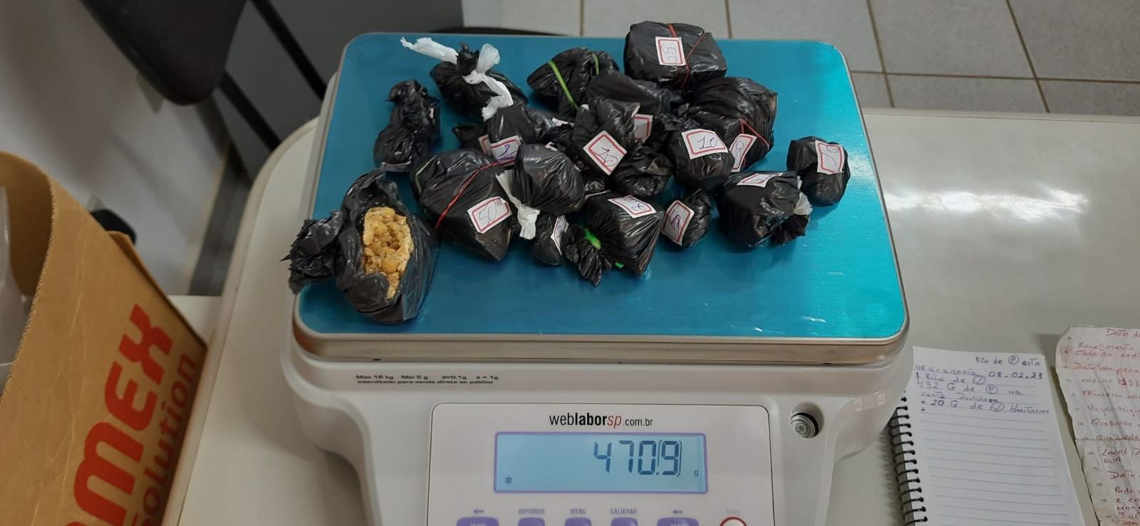 Além das drogas (22 porções de crack com peso total de 500 gramas), também foram apreendidos dois telefones celulares, quatro folhas de papel, três delas contendo anotações alusivas ao tráfico e outra sobre uma facção criminosa, além de uma balança de precisão com resquícios de crack.