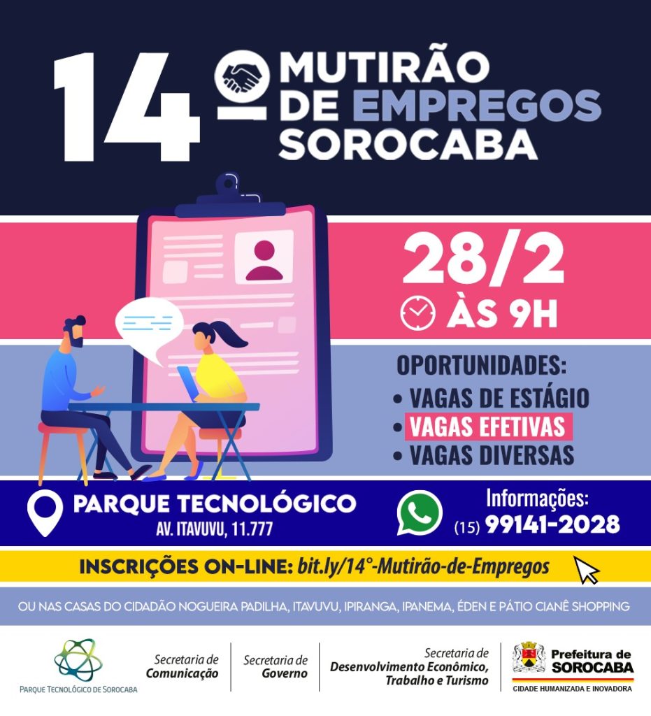 A Prefeitura de Sorocaba, por meio da Secretaria de Desenvolvimento, Trabalho e Turismo (Sedettur), com o apoio da Secretaria de Governo (Segov), da Secretaria de Comunicação (Secom) e do Parque Tecnológico de Sorocaba (PTS), realizará, no dia 28 de fevereiro, às 9h, a 14ª edição do Mutirão de Empregos Sorocaba.