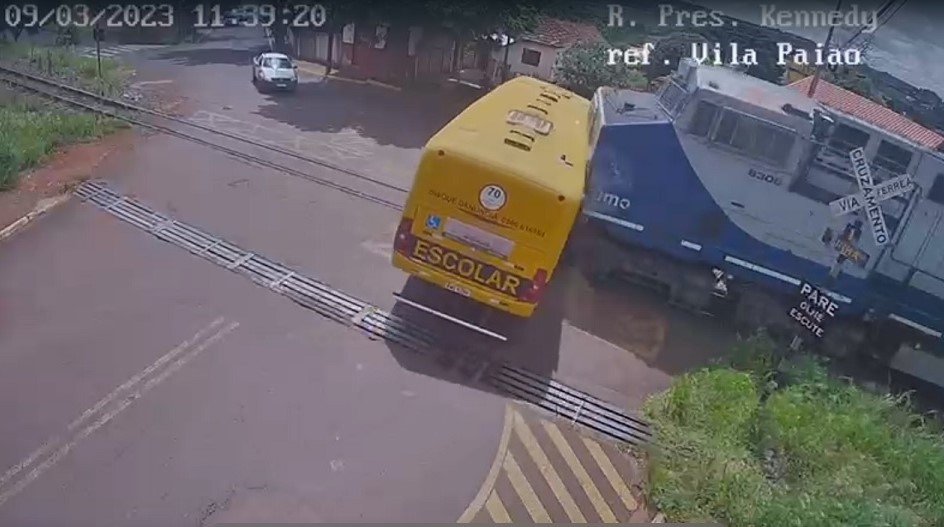 Imagens mostram que o ônibus é atingido pelo trem ao passar pelo trilho. O coletivo transportava 29 pessoas, sendo 25 crianças da Apae (Associação de Pais e Amigos dos Excepcionais), três monitoras dos alunos e o motorista do veículo.