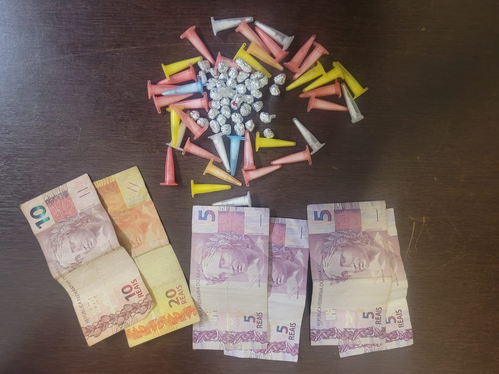 Com eles foram localizadas 71 porções de maconha, 41 de cocaína, 41 de crack, R$ 100,00 em dinheiro, além de um simulacro de arma de fogo e aparelhos celulares.