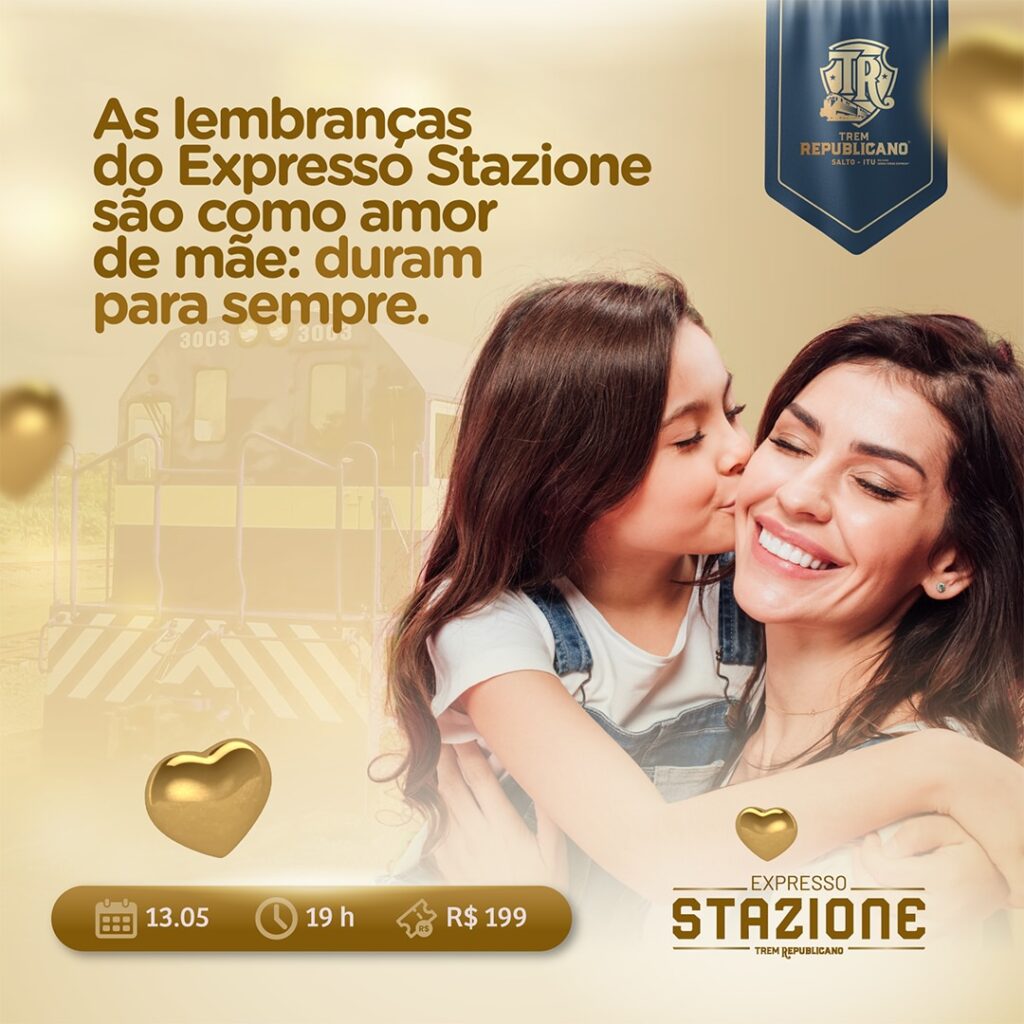 Não há nada mais gostoso do que viver experiências únicas ao lado de quem amamos. O Expresso Stazione foi pensado para quem busca surpreender neste Dia das Mães. As comemorações vão começar no sábado, dia 13, com passeio noturno no Trem Republicano. A recepção será às 19h, na estação ferroviária de Itu, com espumante e música “ao vivo”. O percurso terá apresentação do cantor Harley Castro e open bar de água, cerveja e refrigerante, até Salto.