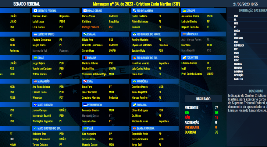 O Plenário do Senado Federal aprovou, nesta quarta-feira (21), o nome de Cristiano Zanin, 47 anos, para ocupar o cargo de ministro do Supremo Tribunal Federal (STF). Foram 58 votos a favor e 18 contrários, sem abstenções. Eram necessários 41 votos pela aprovação.