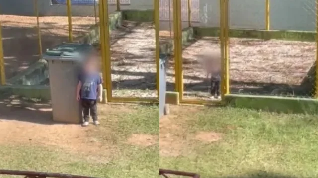 Imagens gravadas pela vizinhança, mostravam uma criança chorando enquanto estava dentro de um banco de areia, fechada com um alambrado.