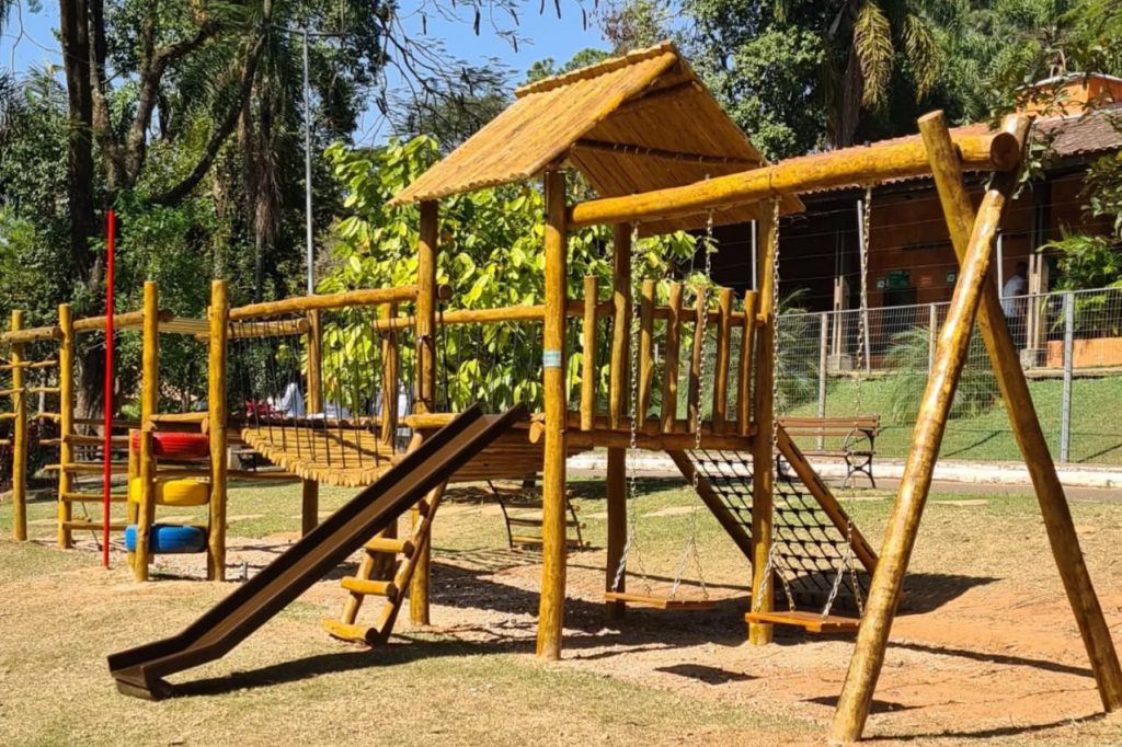 O novo play para as crianças brincarem fica localizado na área próxima ao serpentário e já está disponível para uso. Todo feito em madeira de reflorestamento, conta com balanço, escorregador, escalada, ponte e escada de cordas.