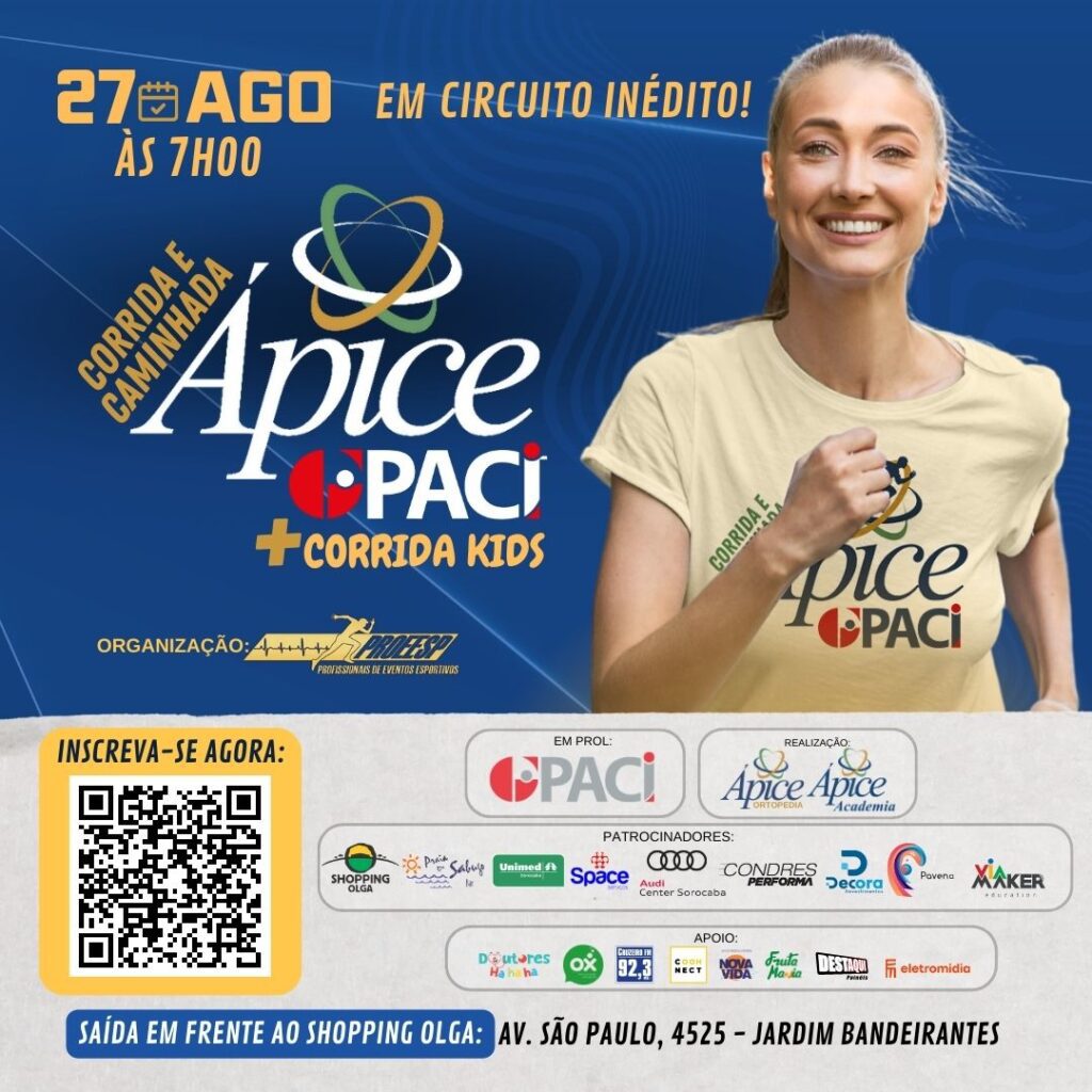 E no domingo, dia 27 de agosto, acontece a corrida de rua Ápice GPACI, com um circuito inédito pelas ruas de Sorocaba. A Corrida Ápice GPACI proporciona não apenas o esporte, mas também o apoio a uma causa muito importante. Cada participante contribui diretamente para o trabalho do GPACI, ajudando crianças no tratamento contra o câncer.