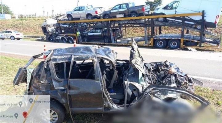 Na imagem é possível ver o caminhão de transporte de veículos trafegando na via, quando um carro Renault Sandero, que estava no sentido oposto, invade a pista contrária e bate de frente com o veículo. Com o impacto da colisão, a frente do carro e a cabine do caminhão ficaram destruídas.