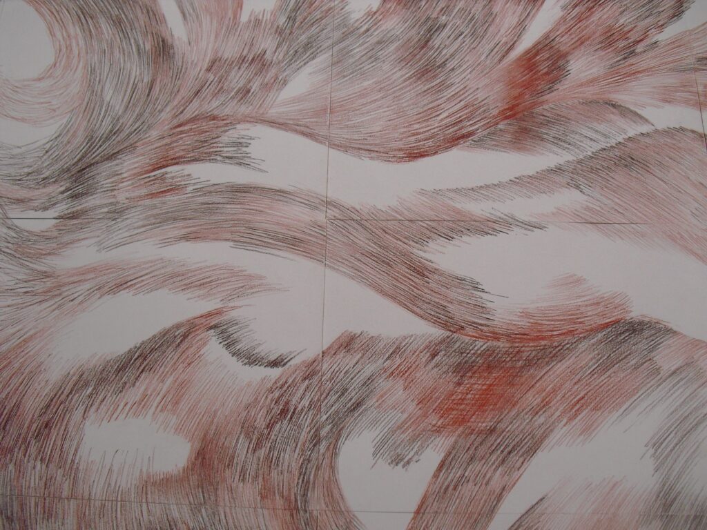 Em meio à incandescência da cor, destaca-se a densidade dos escuros sedutores, criando áreas de profundidade e introspecção. Dramaticidade a qual se soma a organicidade do movimento das linhas, que ora se aglomeram e ora se abrem criando espaços penetráveis e desenhando caminhos a serem percorridos pelos olhos e vivenciados pelos sentidos.