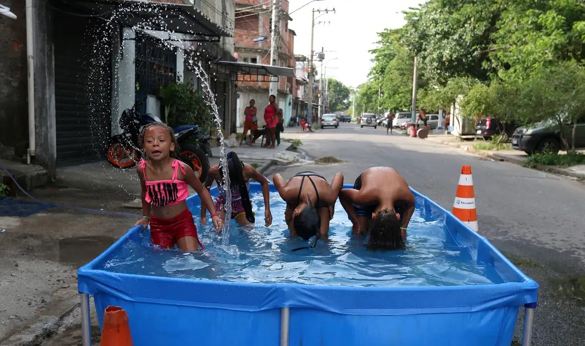 No centro da cidade e nas periferias, quem precisava sair para trabalhar ou estudar, se refrescava como podia. No Complexo da Maré, na zona norte do Rio, piscinas de plástico montadas no meio da rua e chuveirões fizeram a festa de crianças, adolescentes e até adultos em meio à sensação térmica sufocante.