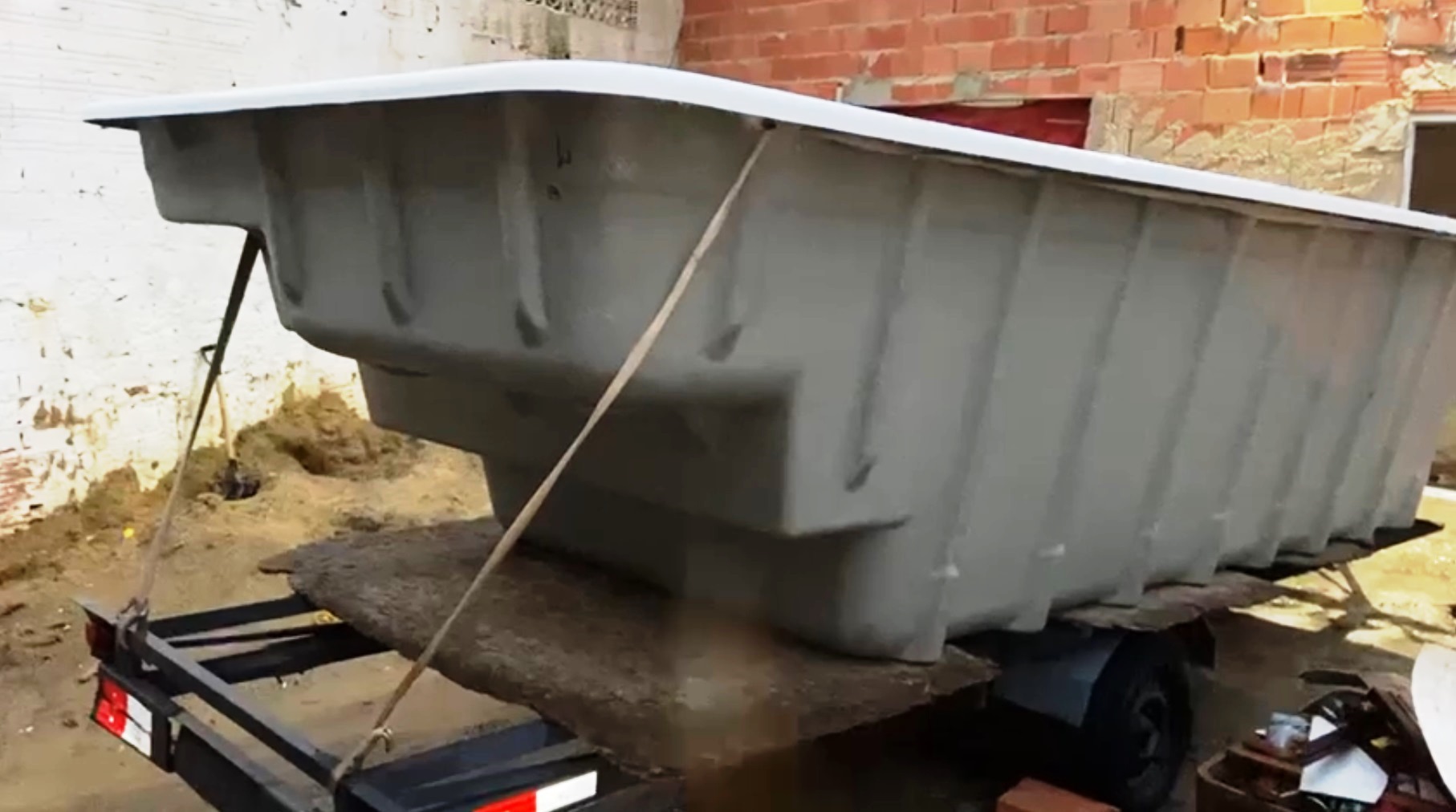 A piscina, de aproximadamente cinco metros de comprimento, ainda estava sobre a carreta de reboque, também furtada da loja e usada para fazer o transporte. O veículo estava sem placas, mas, pelo número do chassi, foi possível fazer a confirmação. Na sequência, a vítima reconheceu, tanto a piscina, quanto a carreta de transporte.