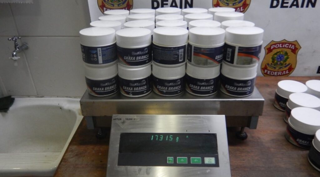 Em outra ação, esta realizada por servidores da Receita Federal na fiscalização de cargas aéreas, foram apreendidos mais de 35 Kg de cocaína ocultos dentro de 117 embalagens de graxa marítima, misturados a um lote total de 1.200 potes. A carga tinha como destino final Hong Kong.