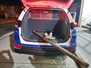 No momento em que as equipes de Saúde e da GCM chegaram, o homem se muniu de um caibro de madeira, medindo cerca de dois metros, e passou a ameaçar a todos à sua volta, recusando-se a ser levado para receber atendimento médico. As equipes tentaram contê-lo, no entanto, ao ter o pedaço de madeira retirado de suas mãos, o rapaz conseguiu alcançar um bloco de concreto e o atirou na direção dos guardas municipais, acertando um deles na cabeça, que caiu desacordado.