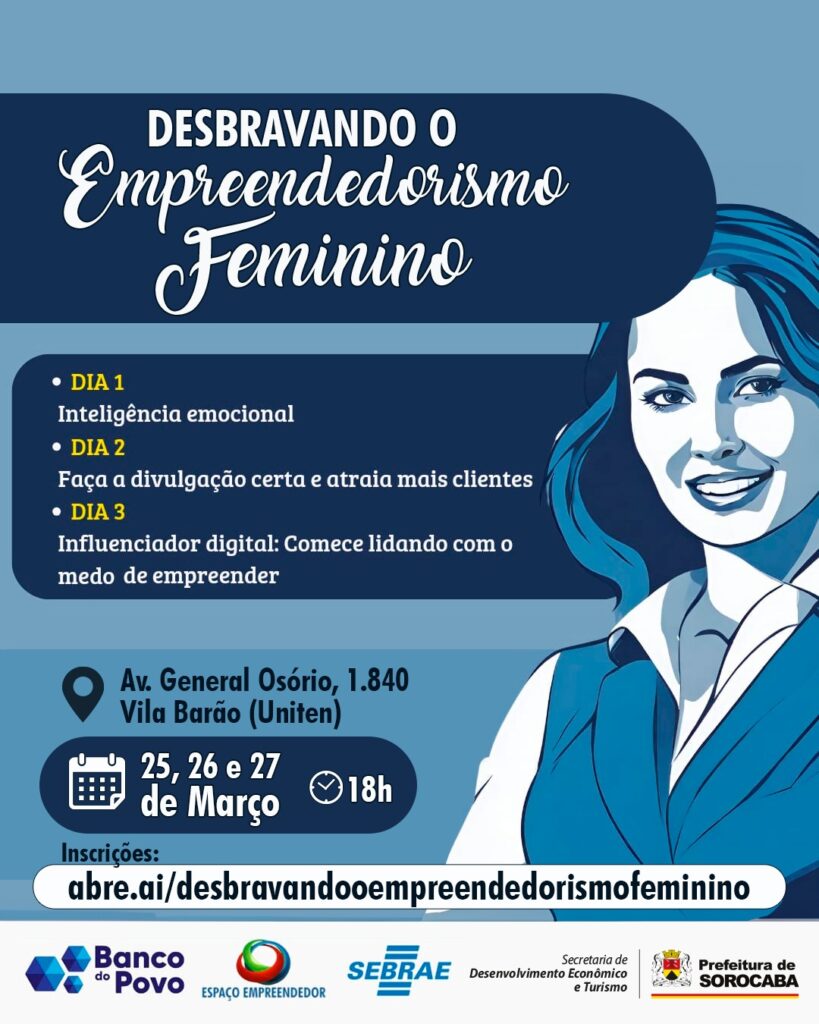A Prefeitura de Sorocaba, por meio do Espaço Empreendedor em parceria com o Banco do Povo, ligados à Secretaria de Desenvolvimento Econômico e Turismo (Sedetur), em parceria com o Serviço Brasileiro de Apoio às Micro e Pequenas Empresas (Sebrae), definiram nova data para o evento “Desbravando o Empreendedorismo Feminino”, que vai acontecer nos dias 25, 26 e 27 de março.