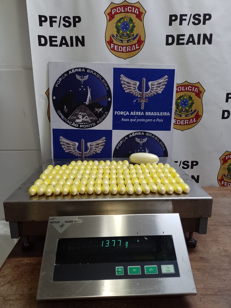 Oficiais da Força Aérea Brasileira que, no âmbito da GLO (Garantia da Lei e da Ordem), fiscalizavam os passageiros junto aos pórticos migratórios, entrevistaram uma mulher e, em razão de suspeitas, realizaram busca pessoal, momento em que foram encontradas diversas cápsulas e um volume, envolto em preservativo, contendo substância semelhante a cocaína. A suspeita, uma brasileira de 26 anos de idade, que pretendia embarcar para a França, foi conduzida à delegacia da PF onde recebeu voz de prisão, após os peritos federais confirmarem que a substância encontrada, que totalizou mais de um quilo, era a droga cocaína. A mulher também foi encaminhada ao hospital público para passar por exames, visando a proteção à sua vida, uma vez que havia a possibilidade de que tenha engolido outras cápsulas.