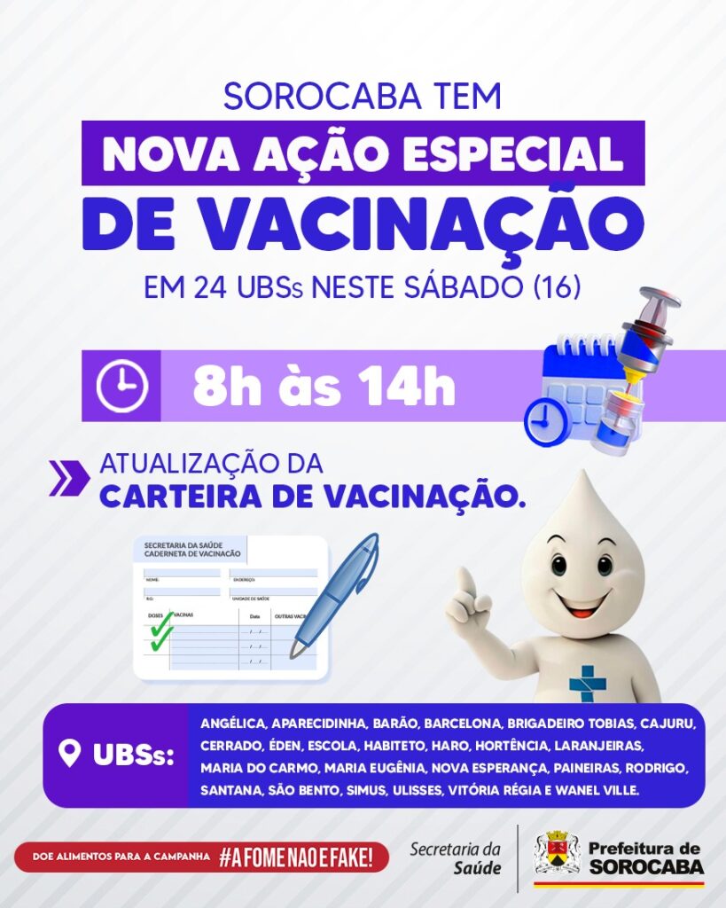 Com o intuito de sempre ampliar a oferta de vacinação aos munícipes, principalmente àqueles que não conseguem se imunizar durante a semana, o Município de Sorocaba ofertará mais uma possibilidade de atualização da Carteira de Vacinação, neste sábado (16), das 8h às 14h, em 24 Unidades Básicas de Saúde (UBSs): Angélica, Aparecidinha, Barão, Barcelona, Brigadeiro Tobias, Cajuru, Cerrado, Éden, Escola, Habiteto, Haro, Hortência, Laranjeiras, Maria do Carmo, Maria Eugênia, Nova Esperança, Paineiras, Rodrigo, Santana, São Bento, Simus, Ulisses Guimarães, Vitória e Wanel Ville.