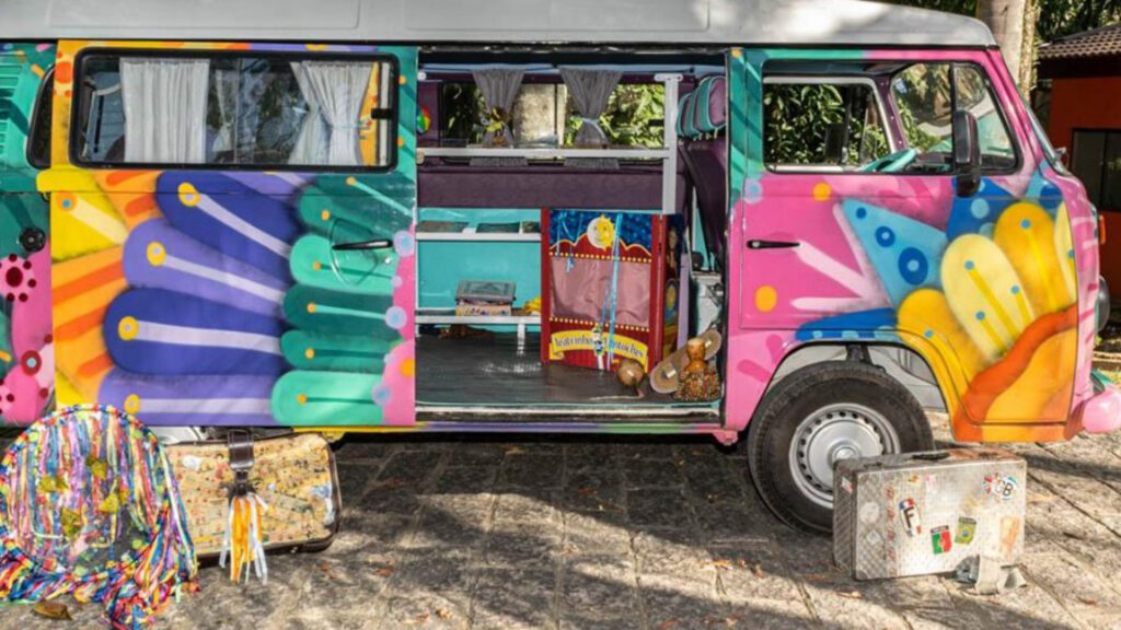O veículo, que é pura arte, por dentro é recheado de livros e instrumentos musicais e por fora carrega o grafite único do artista Biel Siqueira. Haverá uma contação de histórias e uma visita mediada na Kombi Literária.