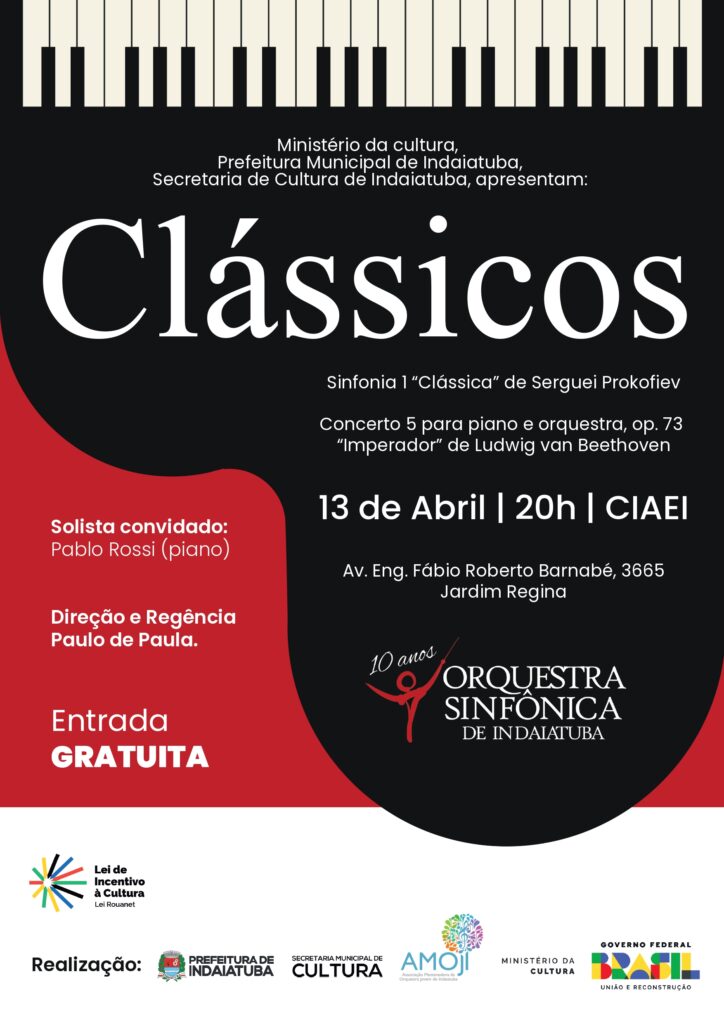 O encontro da Orquestra Sinfônica de Indaiatuba deste mês reúne em seu programa a Sinfonia 1 de Prokofiev e o Concerto 5 para piano e orquestra de Beethoven, também conhecido como Concerto Imperador. Tendo o piano como protagonista, a apresentação terá participação do renomado pianista Pablo Rossi como solista convidado. O concerto acontece no próximo dia 13, a partir das 20h, na sala Acrísio de Camargo (Ciaei). Direção e regência são do maestro Paulo de Paula e a entrada é gratuita.