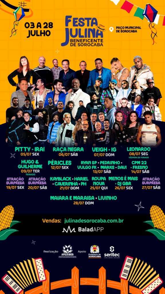 Os ingressos já estão à venda e podem ser adquiridos pelo site: julinadesorocaba.com.br ou a partir de maio em pontos de venda oficiais espalhados pela cidade.