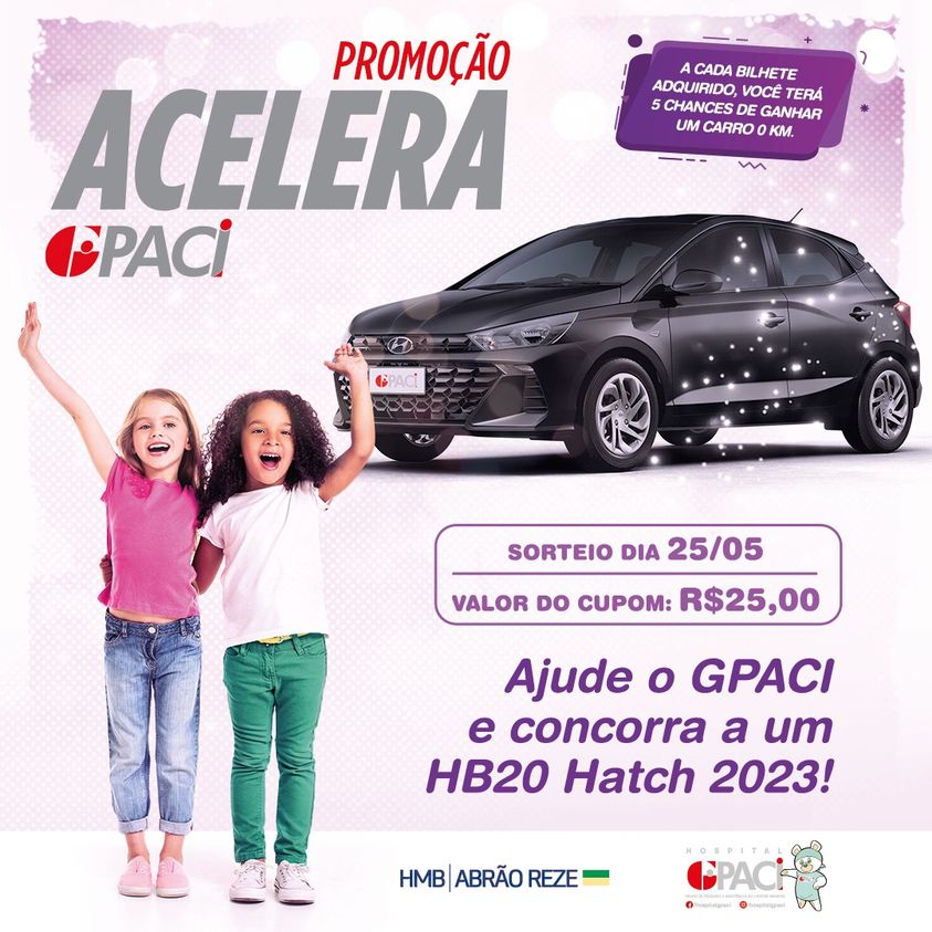 A campanha, que já está na oitava edição, visa arrecadar fundos para o custeio de serviços médicos especializados em oncologia pediátrica. O bilhete é comercializado a R$ 25,00 e dá direito a cinco chances de ganhar um New HB20 1.0 Sense 2023, na cor preto ônix, doado pelo empresário Sérgio Reze, presidente do grupo Abrão Reze. O sorteio do Acelera Gpaci 2024 será no dia 25 de maio pela Loteria Federal.